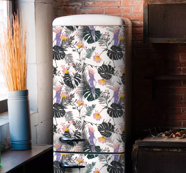 一个充满活力的热带花卉图案,展现了在郁郁葱葱的叶子和多彩花朵之间的鹦鹉。这种设计为任何空间增添了生动而异国情调的气息,完美提升了美感。
