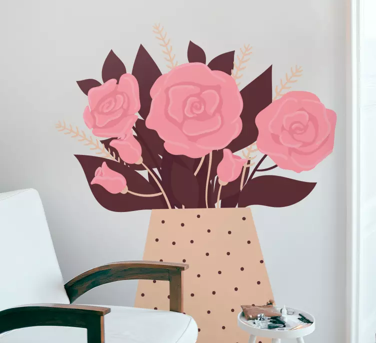 一款美丽的花卉作品,包含粉色玫瑰,摆放在一个点缀着圆点的花瓶中。这一设计为任何空间增添了一丝优雅,庆祝花朵的自然美,同时营造出温馨宜人的氛围。