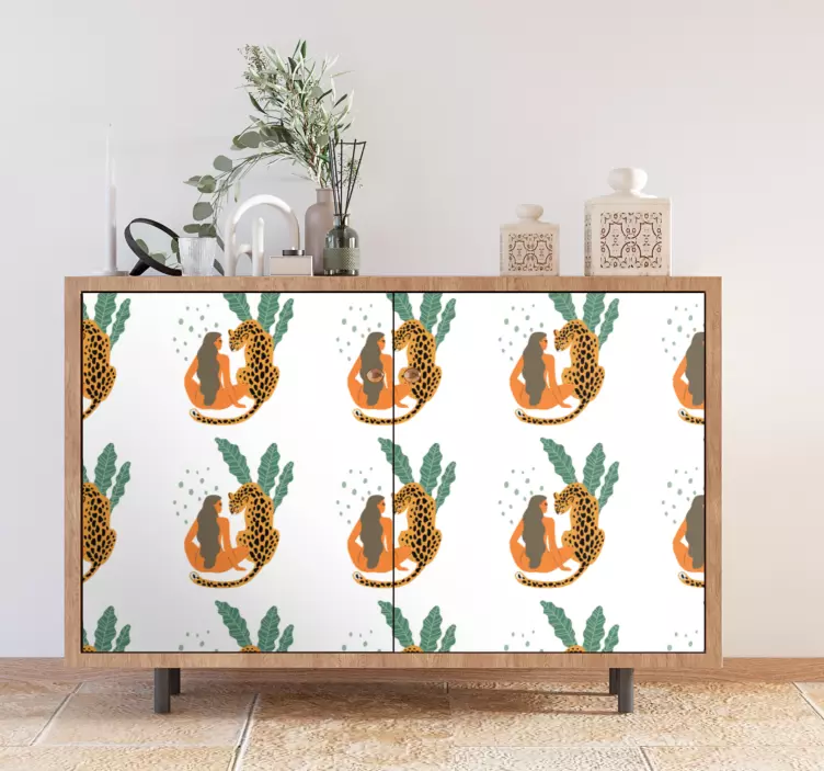 欢迎来到我们的家具贴纸豹子植物场景的奇妙世界!这款独特的手绘设计结合了女士、豹子和热带植物的元素,呈现出异想天开的动物图案,完美地融入自然的氛围。您可以轻松地将这款家具贴纸运用到您的家居装饰中,为每一个空间增添生动活泼的气息!