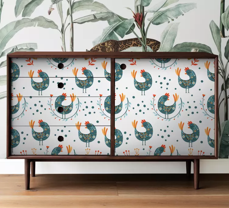我们的家具贴纸生动的公鸡插图为您的空间增添了生动有趣的气息。这款独特的设计融合了俏皮的动物元素,展现了丰富多彩的图案,仿佛将农场动物的生机勃勃带入您的家居环境。鸡的插图与花的图案相得益彰,使得这款家具贴纸不仅美观而且充满活力,完美适合任何想要提升家居氛围的您!