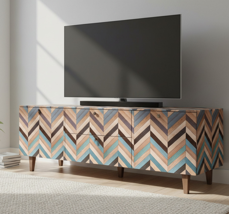 一款时尚的媒体控制台采用了引人注目的鱼骨图案,结合了各种木材和色彩的色调。其设计为任何居住空间带来了现代而又乡村的优雅,完美地衬托了当代装饰。几何排列营造出一种动感和温暖,使其成为房间的焦点。