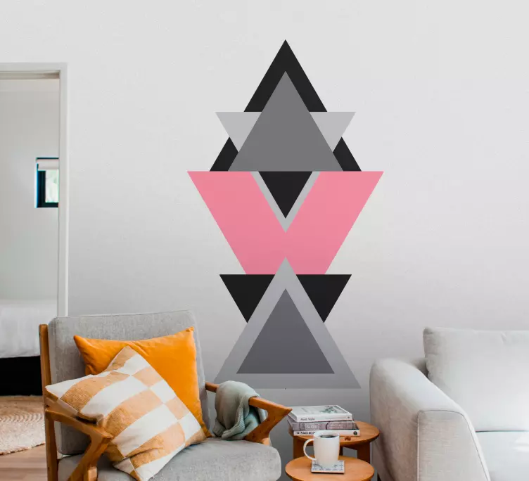 參考:: A48905这幅艺术作品展示了一组重叠的三角形,颜色包括粉色、灰色和黑色。设计创造了引人注目的视觉效果,以其大胆的几何形状增强了现代空间。颜色的相互作用为构图增添了深度和趣味。