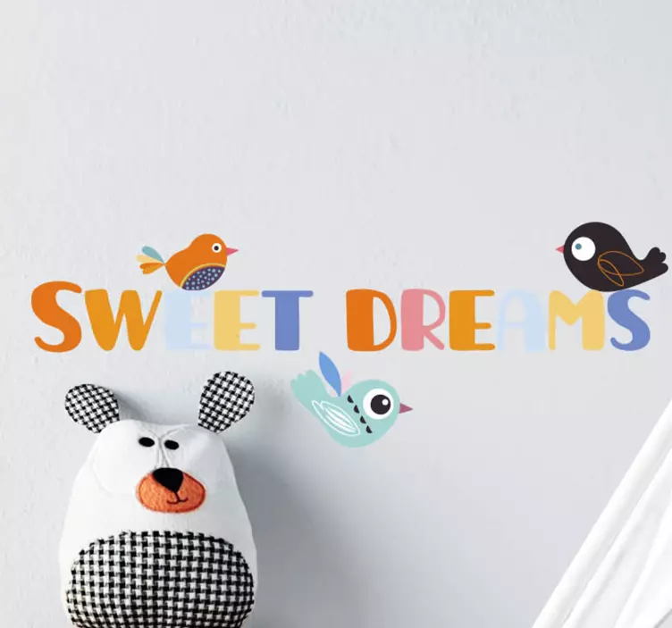 參考:: A51016一个充满活力的展示,展示了快乐的鸟儿装饰着一个传达安宁睡眠信息的奇幻短语。非常适合为孩子的空间增添亮色,色彩和角色的结合为任何房间增添了俏皮的气息。
