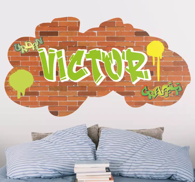 參考:: A49593这是一件充满活力且可定制的作品,采用粗犷的涂鸦风格在砖墙背景上展示一个名字,点缀着色彩的飞溅。非常适合为任何空间增添个人风格,这一设计提升了城市美学,同时允许个性化表达。