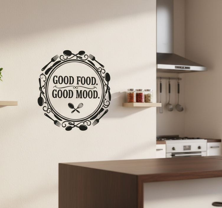 一个装饰性的厨房墙面设计以圆形边框装饰,边框上点缀着厨房用具。显眼的短语 "GOOD FOOD. GOOD MOOD." 强调了美好餐食与积极氛围之间的联系,激发出一个愉快的烹饪空间。这是一个理想的装饰,适合热爱美食和家庭厨师,旨在提升厨房的装饰风格。