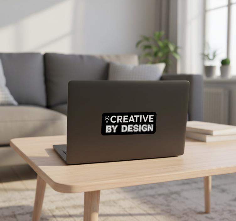 一台笔记本电脑放置在一张木桌上,周围是一个温馨的客厅环境。它的设计突出强调创造力和个性。短语 'CREATIVE BY DESIGN' 激励着原创性和个人表达,鼓励用户在各种项目中拥抱他们独特的风格。