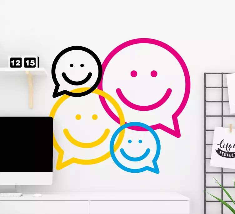 參考:: A49042一组不同大小和颜色的笑脸以俏皮的方式排列,象征着快乐和交流。这些带有对话气泡的欢快图标唤起情感,营造出一种生动的氛围,非常适合旨在激发积极性的空间。