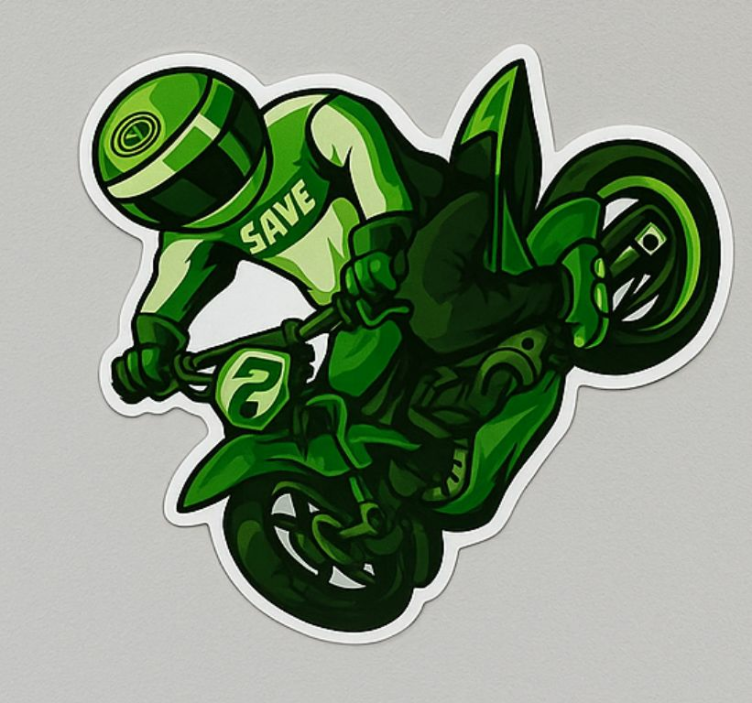 一幅动态插图描绘了一名骑手在摩托车上执行惊险特技。设计传达了一种冒险和兴奋的感觉。词语'SAVE'突出了骑手的服装,暗示在这种充满肾上腺素的氛围中有一种保护或谨慎的信息,反映了极限运动中的追求刺激的精神。