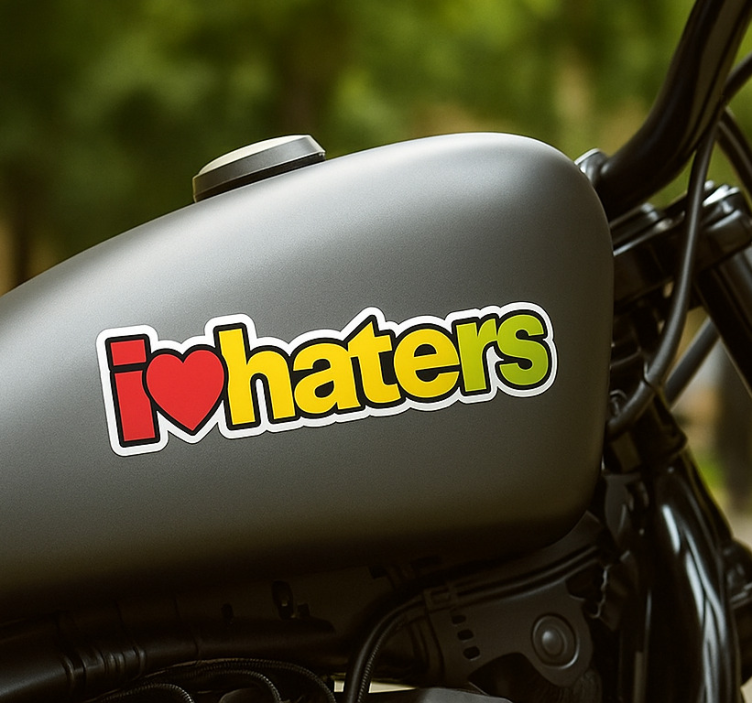 一幅生动的图形附在摩托车油箱上,传达了一个关于拥抱负面情绪的大胆信息。短语 'I love haters' 暗示了一种反抗和韧性的感觉,鼓励人们相信批评者可以激发自己的热情。多彩的设计为整体美感增添了一丝俏皮的元素。