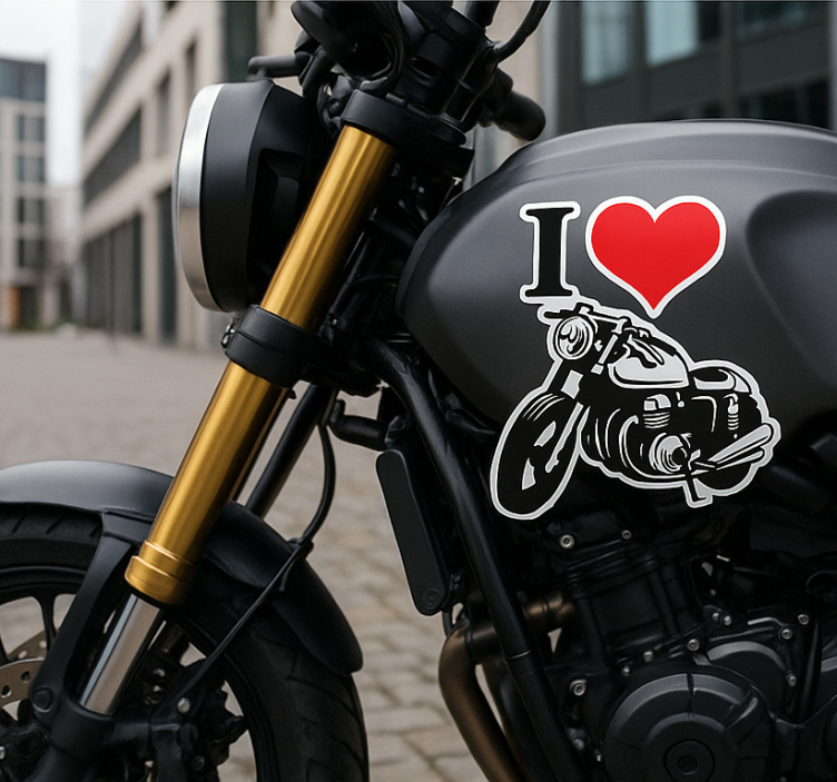 一个大胆的设计展示了一幅经典摩托车的插图,伴随着短语 "I ❤️"。这个表达 encapsulates 对骑行的热爱,吸引那些重视冒险和自由的爱好者。它非常适合为任何摩托车或装备增添个性,传达了骑手与机器之间的深厚联系。