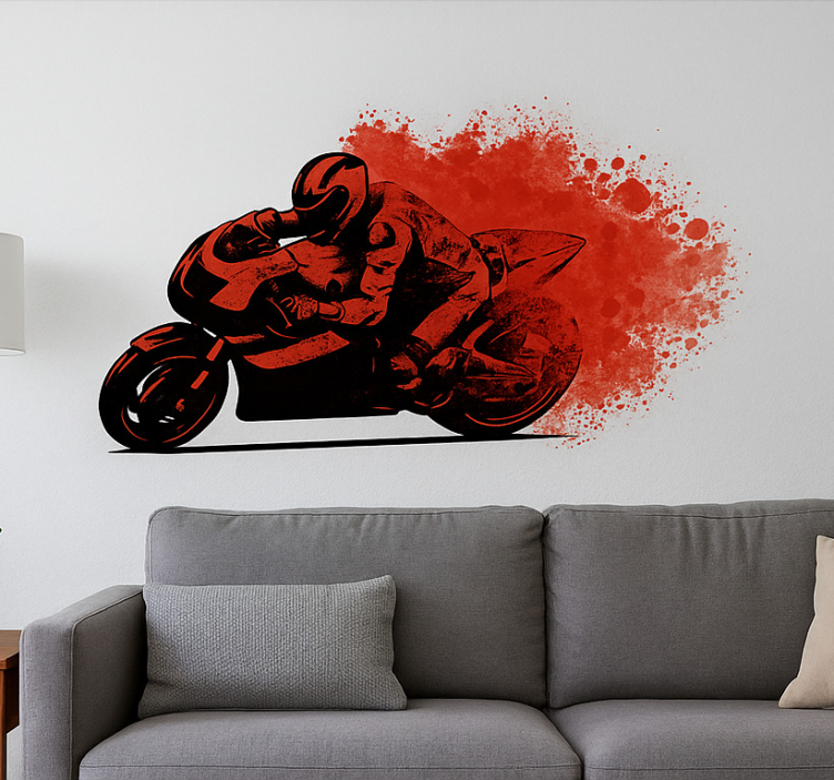 一个充满活力的设计展示了一名摩托车赛车手在急转弯时的姿态,传达出速度与肾上腺素的感觉。背景中的大胆飞溅增添了动感,强调了运动的氛围。这个视觉效果捕捉了摩托车赛车的刺激,吸引了爱好者,并为任何空间增添了生机勃勃的色彩。