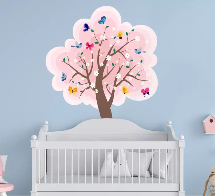 一棵生机勃勃、盛开着的树木上点缀着五彩斑斓的蝴蝶和娇嫩的花朵。这幅欢快的场景展现了大自然的美丽,非常适合为任何空间增添一丝奇幻的气息。粉色花朵与顽皮的蝴蝶的组合创造了一个令人愉悦的氛围。