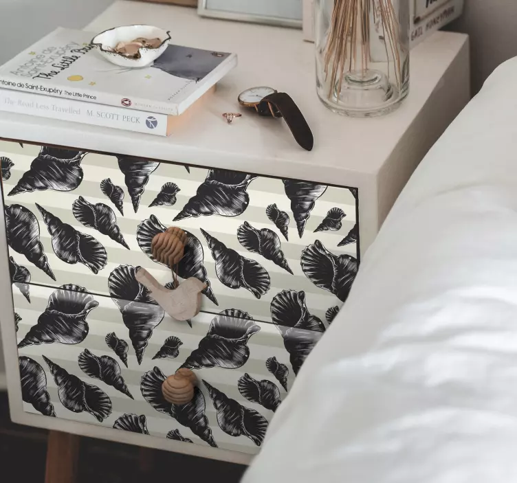 这款墙面贴纸采用贝壳图案设计,展现了自然界的优雅魅力。设计灵感源自于海洋,结合了家具和壳的元素,呈现出条纹与图案的完美结合。黑色和白色的搭配,使其在任何家居装饰中都显得格外出众,带来一种简约而不失华丽的感觉。