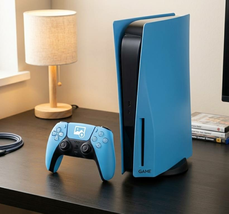 这款游戏机及其配套的控制器采用鲜艳的蓝色设计,展现出现代美感。流畅的线条与复杂的细节相得益彰,图形元素则让人联想到城市天际线和花卉图案,使其成为任何设备中引人注目的亮点。