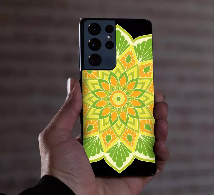 我们的贴纸三星花卉曼荼罗元素设计灵感来源于自然,展现出曼陀罗的精致图案,色彩以绿色、黄色和橘子色为主,仿佛将阳光洒落在手机屏幕上,带来无限生机。每一片曼陀罗图案都像是在诉说着自然的故事,给您的手机增添了一抹独特的艺术气息。
