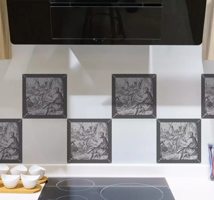我们的贴膜贴纸历史场景瓷砖以独特的设计展现了一个充满文化和艺术气息的历史场景。图案中描绘了传统的磨坊,展现了男人在瓷砖前的忙碌身影。黑白色调的搭配让这款产品更具工艺感,使得每一块瓷砖都成为了一个小小的艺术作品,仿佛带您走进了历史的长河,感受那一份独特的景观魅力。