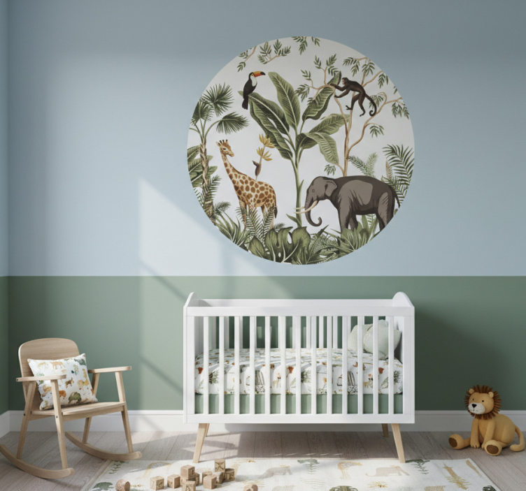 这幅图描绘了一个生机勃勃的丛林场景,包含了各种野生动物,如长颈鹿、大象、巨嘴鸟和猴子,栖息在郁郁葱葱的植物和热带植物中。这种俏皮的设计营造了一个充满活力的氛围,非常适合激发儿童对自然的好奇心和热爱。它强调了野生动物保护的重要性。