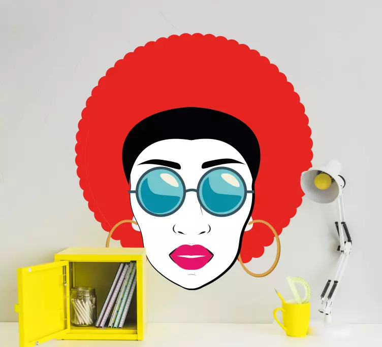 一幅引人注目的女性形象,拥有超大蓬松的非洲发型,搭配时尚的太阳镜和圈形耳环。鲜艳的色彩唤起自信和庆祝的感觉,体现出一种大胆的风格,吸引着人们的注意。