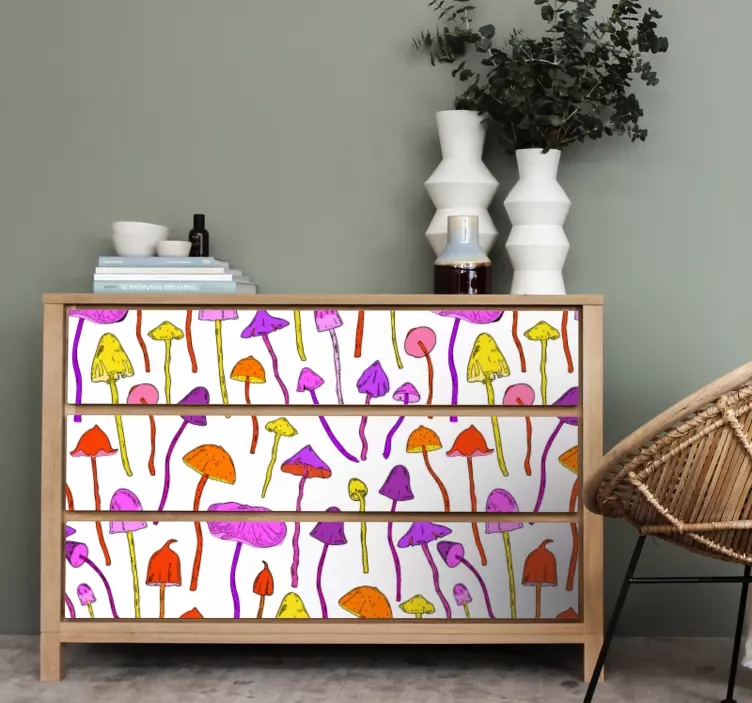 欢迎来到我们独特的动物贴画色彩斑斓的蘑菇图案的世界!这款设计灵感源于自然,结合了迷幻的蘑菇图案,展现出丰富多彩的插图,为您的家具增添了生机。每一个细节都体现了植物群的美丽,使您的空间瞬间焕发活力。