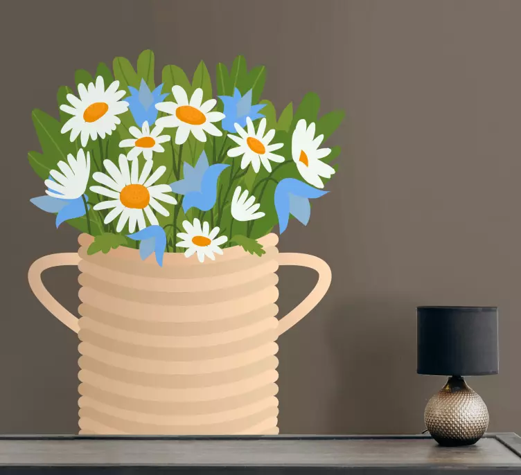 參考:: A48110一个精美的花瓶,里面插满了鲜艳的雏菊和蓝色花瓣,搭配着郁郁葱葱的绿叶。这一迷人的花卉组合为任何空间带来了清新的自然气息,增添了愉快而充满活力的氛围。