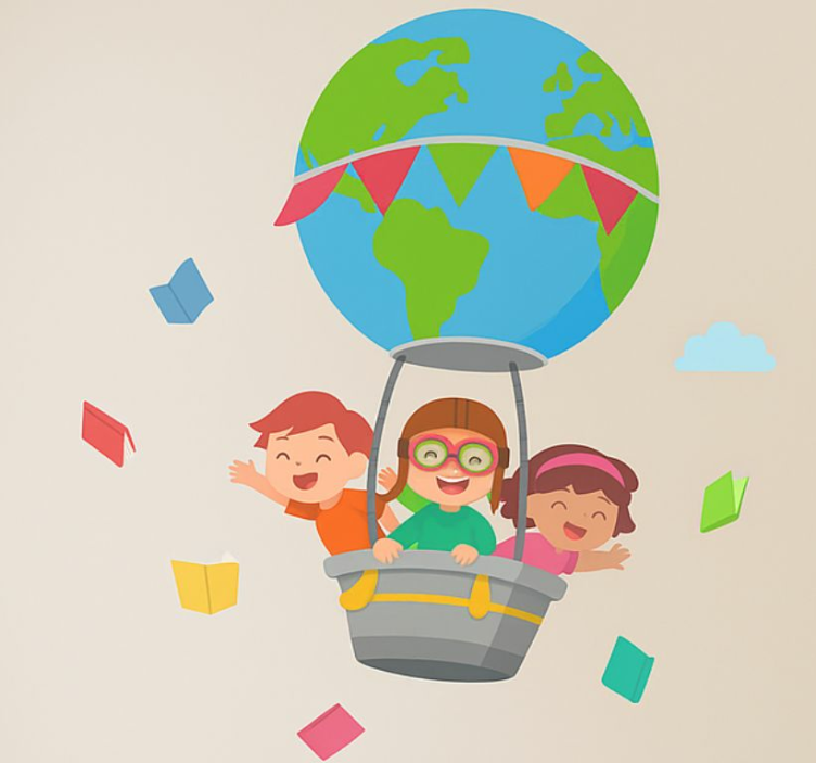 三个快乐的孩子在热气球上欢快地漂浮,俯瞰着五彩斑斓的世界地图。热气球上装饰着鲜艳的旗帜,周围漂浮着书本,暗示着冒险和学习的主题。引用的句子'The sky is not the limit; it's just the beginning' 强调了探索和想象的重要性。