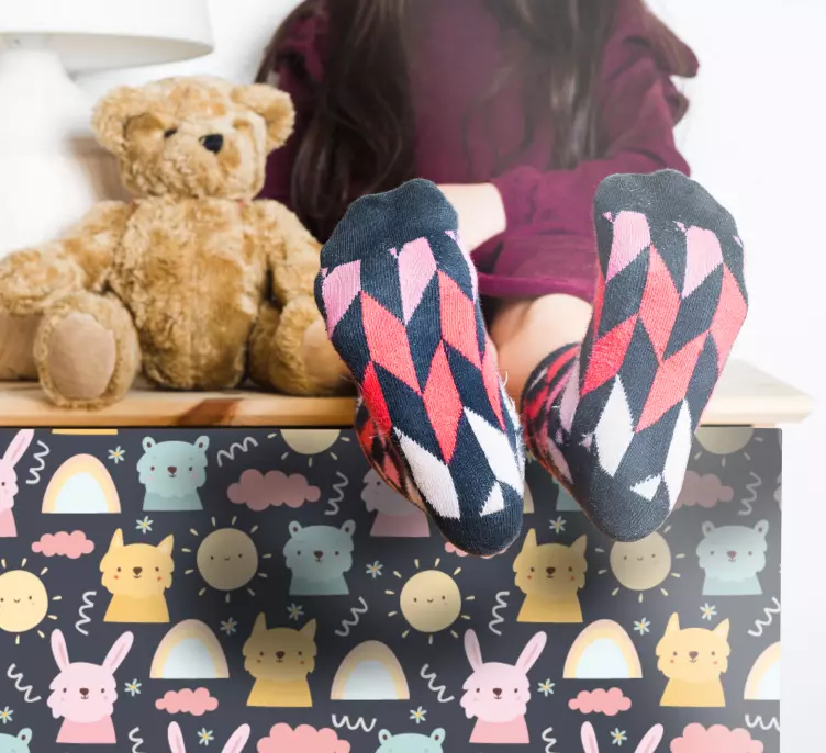 參考:: A51583一个充满趣味的设计,展示了各种可爱的动物角色、快乐的云朵和阳光。柔和的色彩与奇幻的元素相结合,使其成为儿童空间的完美选择,营造出一个愉快而温馨的氛围。