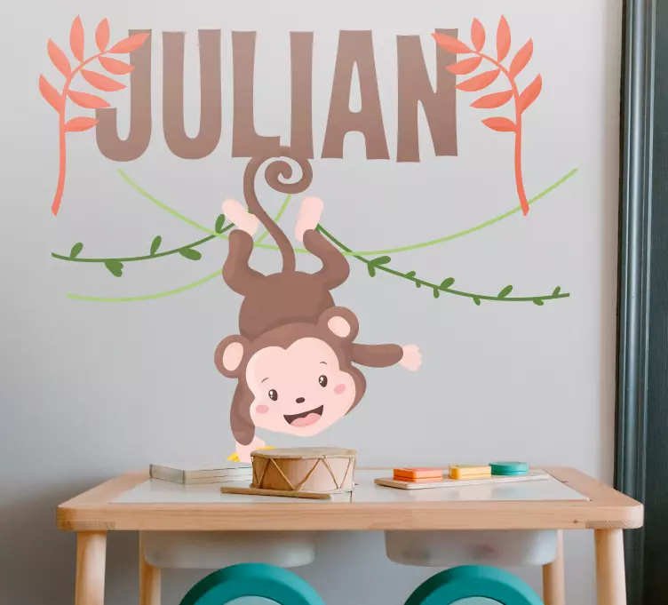 參考:: A49357一个迷人的设计,展示了一只可爱的小猴子倒挂在藤蔓上。设计中包含生动的叶子,并提供个性化选项,非常适合儿童空间。猴子顽皮的表情为任何环境增添了愉悦的气息。