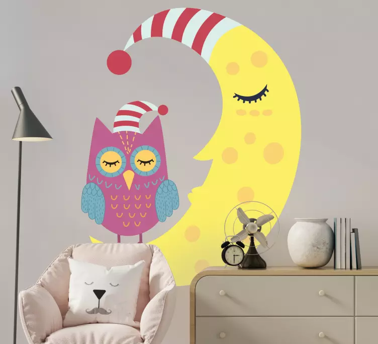 一个可爱的场景,描绘了一只舒适的小猫头鹰栖息在新月上,二者都装饰着俏皮的图案。这一迷人的设计非常适合为儿童空间营造一种奇幻的氛围,促进夜间的宁静与想象力。