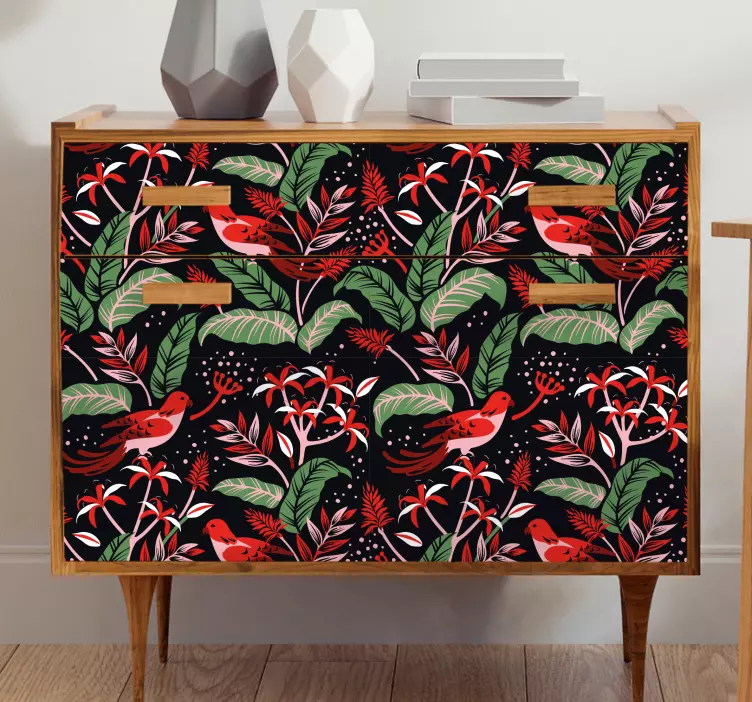 一个充满活力的热带花卉图案,背景是深色的,点缀着红色鸟类和郁郁葱葱的绿色叶子。这个设计结合了各种花卉元素和生动的色彩,营造出一种充满活力和清新的氛围,非常适合为任何环境增添自然的气息。