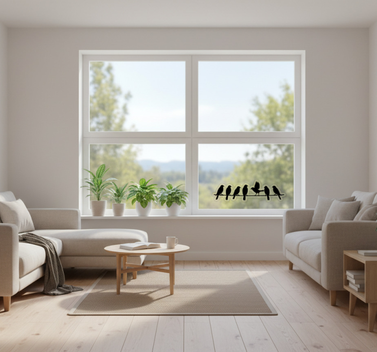 一个宁静的室内环境,展现了时尚的软装和自然绿植的优雅搭配。焦点是一组栖息在树枝上的鸟儿的精致轮廓,象征着团结与连接。这种设计能够提升舒缓的氛围,使空间更加温馨和生机勃勃。