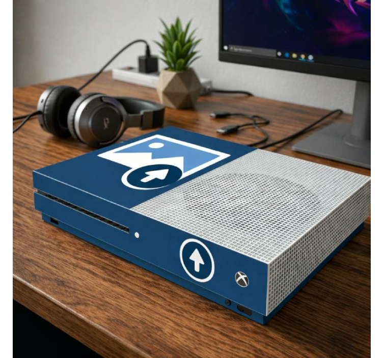 这幅图像展示了一款设计独特的控制台,拥有引人注目的蓝色外观。插图元素包括一个向上的箭头和一个风景图标,增添了独特的风格。周围的配件,包括耳机和一盆植物,完美地衬托了设计,营造出一种清新而振奋的美感。