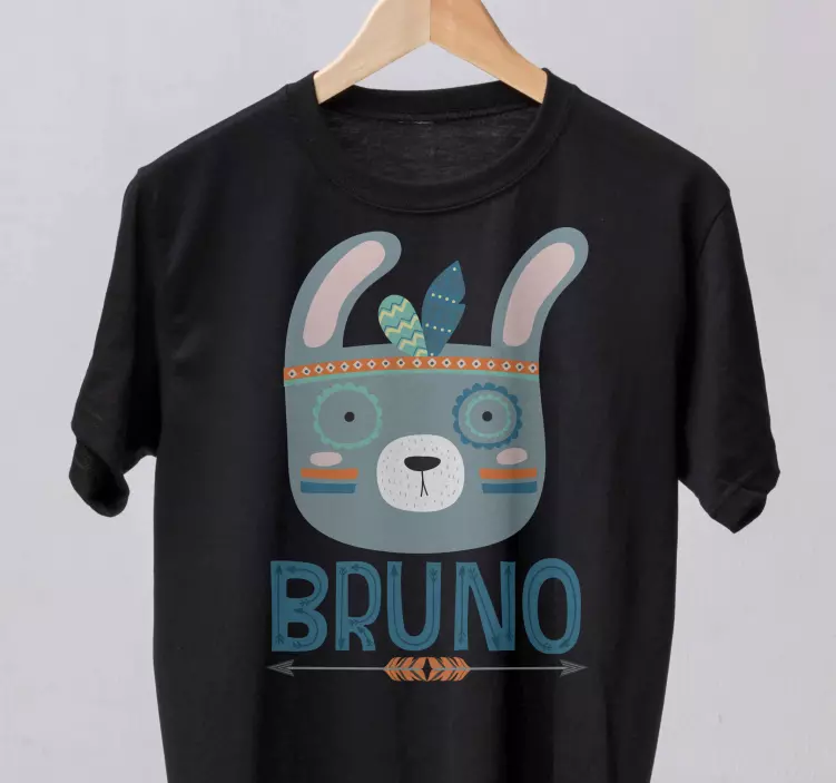 这个迷人的设计展示了一只可爱的兔子脸,配有装饰元素如羽毛和五彩斑斓的图案。名字'Bruno'增添了个性化的触感,使其成为孩子们的绝佳选择。活泼的颜色和富有幻想的角色吸引了年轻观众。