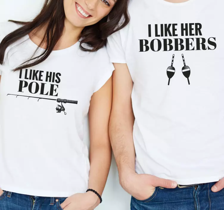 这张图片展示了一对情侣穿着幽默的衬衫,上面印有与钓鱼相关的搞笑语句。每件衬衫都突显了机智的短语,结合了乐趣和魅力,非常适合喜欢一起钓鱼的情侣。这种设计体现了一种轻松愉快的主题,肯定会让穿着者和旁观者都感到开心。