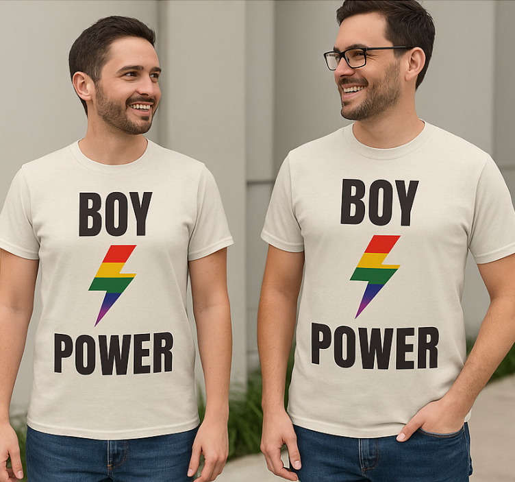 这张图片展示了两位模特穿着相配的T恤,T恤上印有醒目的文字“BOY POWER”。每件衫上都有一个色彩斑斓的闪电图案,象征着活力和能量。设计强调了对LGBTQ+骄傲的支持,传达了关于风格中赋权和团结的声明。中性的背景有效地衬托了这些T恤。