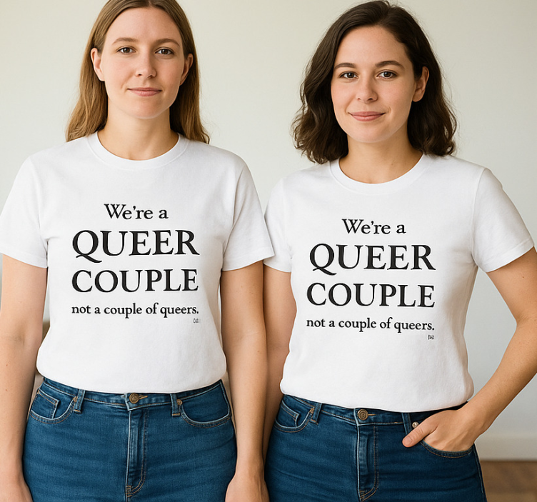 这张图片展示了两位女性穿着相配的白色T恤,T恤上印有醒目的信息。内容是,'We’re a QUEER COUPLE, not a couple of queers.' 这个设计强调了自豪感和身份,适合LGBTQ+的代表性。背景为中性色,聚焦于这一强有力的信息。