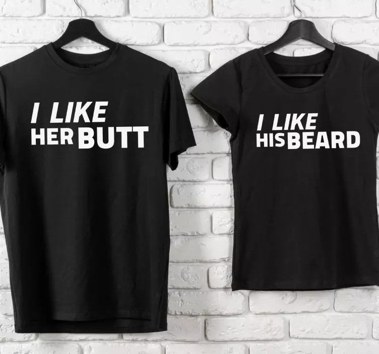这张图片展示了一对情侣的衬衫,上面印有幽默的短语。粗体字与黑色面料形成鲜明对比,使这些语句格外引人注目。这些俏皮的上衣非常适合希望以风格和幽默表达他们关系的情侣。