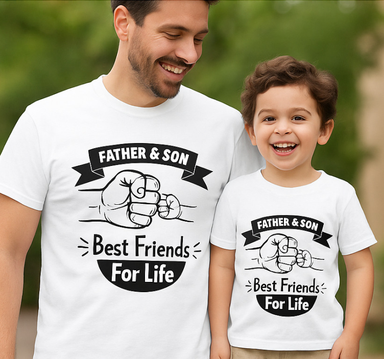 一对快乐的父子微笑着展示着配套的白色T恤。俏皮的设计展示了一个拳头碰拳,象征着他们之间的深厚纽带。粗体字写着 'Father & Son' 和 'Best Friends For Life',强调了他们亲密的关系。户外背景增添了一种温暖、宜人的氛围。