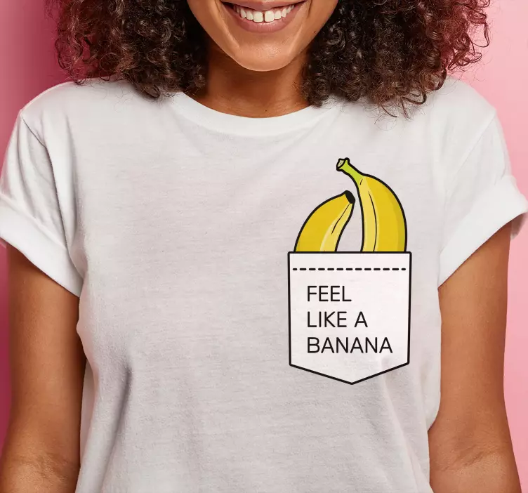 体验香蕉的乐趣,穿上这款特别定制的衬衫。衬衫采用高品质棉制成,确保您的舒适感受。设计灵感来自于两个黄色香蕉,它们被放置在一个白色的口袋中,上面印有卡通风格的文字。这个幻觉口袋带给您无穷的乐趣和惊喜。穿上这件衬衫,您就像是一只可爱的卡通香蕉,让您的衣橱充满活力和趣味。