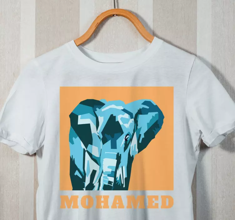 这款几何大象儿童 t 恤由蓝色色调的几何图案组成,共同构成了橙色背景上的大象。您可以选择在下方写下您孩子的名字,让它更加个性化!