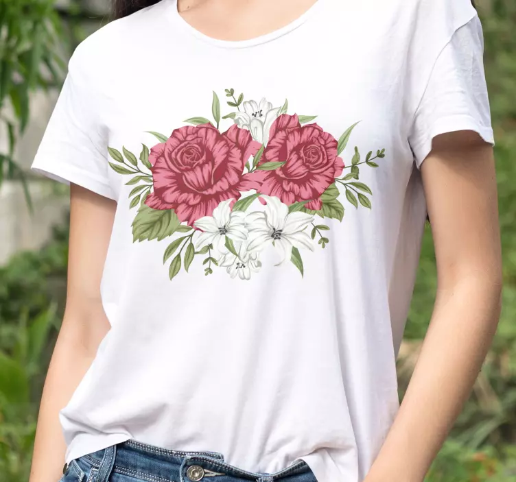 该设计展示了盛开的玫瑰和百合,象征着美丽和优雅。鲜艳的色彩突出,形成引人注目的视觉效果。非常适合休闲穿着,展现了花卉元素的和谐融合,是想要传达清新、振奋氛围的理想选择。