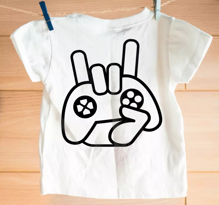 这个充满趣味的设计展示了一个游戏手柄和一个做出摇滚手势的手。非常适合热爱游戏的孩子,它将趣味元素与时尚外观结合在一起。非常适合休闲穿着,这个设计以独特的方式表达了热情和玩乐的精神。