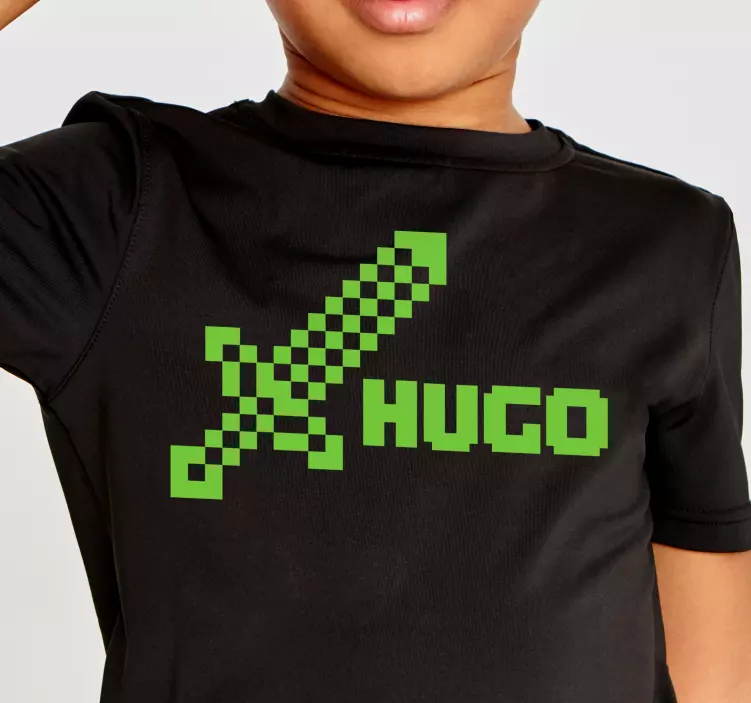 这件充满活力的作品展示了一个像素化的剑设计,并且可以定制名字。鲜艳的绿色与光滑的黑色背景形成了鲜明的视觉效果,非常适合年轻的游戏爱好者。这是任何孩子衣橱中有趣且个性化的补充。
