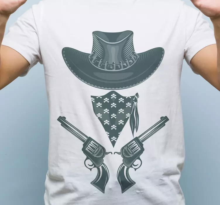 欢迎来到我们的独特设计——T恤衫 牛仔帽与手枪!这款T恤衫以牛仔风格为灵感,融合了西部的经典元素,展现了左轮手枪的魅力和海盗的神秘感。帽子与头巾的搭配,让穿着者仿佛置身于冒险故事之中,成为最酷的角色!无论是日常穿着还是派对打扮,这款T恤衫都能让您在众人中脱颖而出。