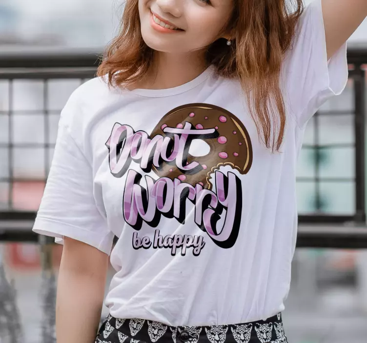 欢迎来到我们的T恤衫,不要担心,快乐生活,带给你无尽的快乐与积极的能量。这款T恤的设计灵感来源于轻松愉快的生活态度,前面印有趣味十足的油炸圈饼插图和充满幽默的文字游戏,旨在传达出我们对生活的热爱。它既时尚又随意,适合各种庆典场合,让你在任何聚会中都能成为焦点,展现出你的个性与风格!