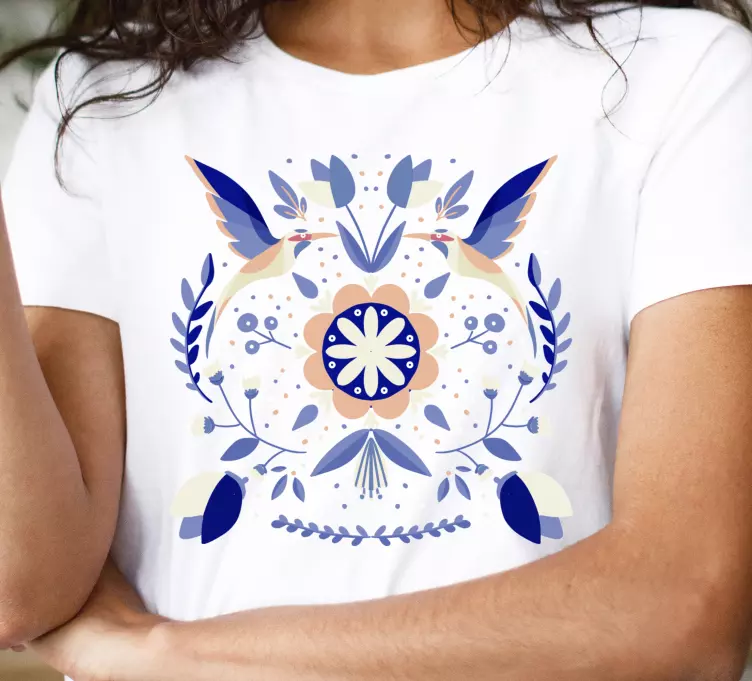 这款T恤衫带花鸟图案设计以其独特的抛光效果和丰富多彩的自然元素为特点,展现了传统民俗学的魅力。设计中融入了生动的鸟类和花的图案,创造出一种装饰性的、异想天开的视觉效果,让穿着者在任何场合都能展现个性与时尚。