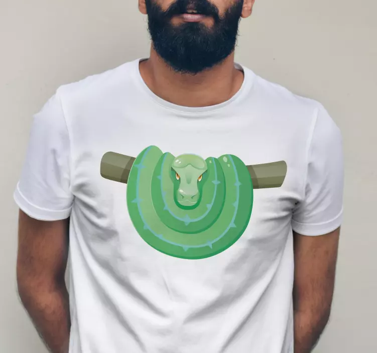 欢迎体验这款独特的绿色蛇形设计的T恤衫!这款T恤结合了蟒蛇的形象与精美的插图,展现出了一种时髦而独特的卡通风格。它的设计灵感来自于自然界中的蛇与分支,形成了一种随意又吸引眼球的视觉效果,让每一个穿上它的人都能在众人中脱颖而出!