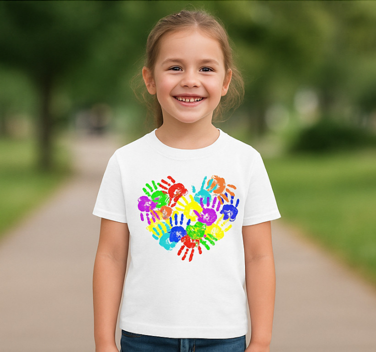 一个快乐的小女孩灿烂地微笑着,穿着一件白色T恤,T恤上装饰着五彩斑斓的手印,排列成心形。这个充满活力的设计展现了多种颜色,体现了创造力和顽皮。背景是一个模糊的风景小路,增强了欢乐的氛围,突显了这件衬衫的艺术魅力。