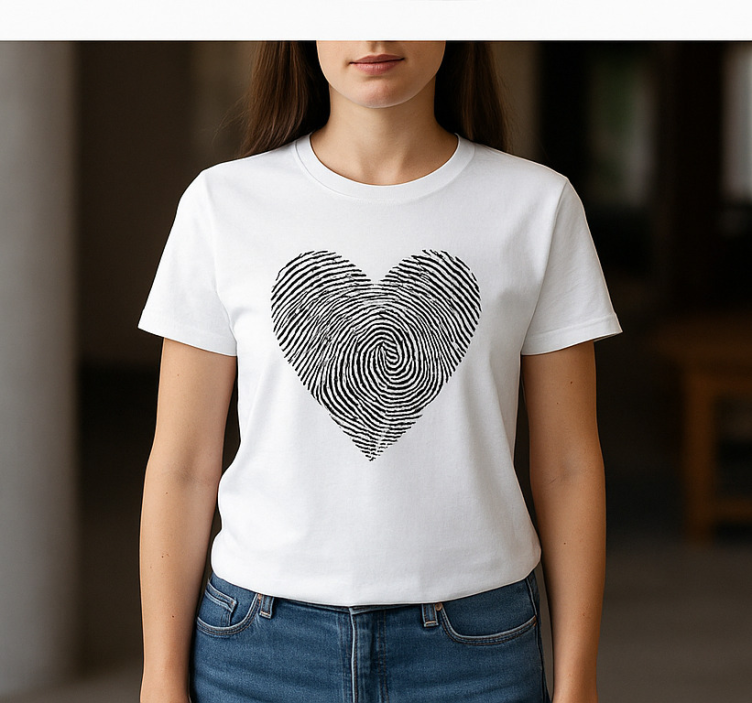 这张图片展示了一款时尚的T恤,特色是由复杂的指纹图案组成的心形设计。衬衫为白色,与大胆的黑色图形形成了干净的对比。它体现了个人身份与艺术表达的独特融合,非常适合追求时尚的人士。