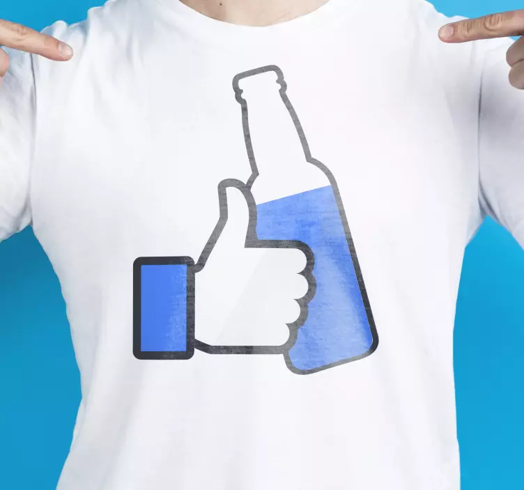 这个独特的设计展示了一种“thumbs up”手势和饮品,象征着认可和享受。采用现代风格,搭配鲜艳的蓝色和干净的白色,捕捉了适合休闲穿着的非正式和庆祝的氛围。