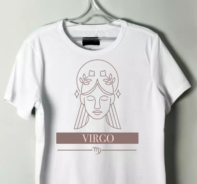 该设计展示了处女座的极简主义表现。插图中描绘了一位宁静的女性形象,身上装饰着叶子,配以优雅的线条。名称 'Virgo' 显著地展示出来,营造出一种和谐的效果,适合占星爱好者。